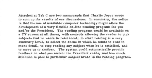 • Sounds a lot like the internet to me, complete with hyperlinks, etc. Apparently it did not happen at least partly because, as the report itself notes, "the balance of experience has been that top-level executives don't like gadgets."