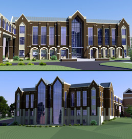 The latest sketch of the new building is in the picture above. For those of you familiar with the campus, the building is set to be north and east of the library in the very front of the campus. The bridge on the third floor (visible in this picture) will connect the new building to the library. The funding for the basic version of the building, as I understand it, is largely complete. We are now looking for some generous donors to make it even more awesome...
